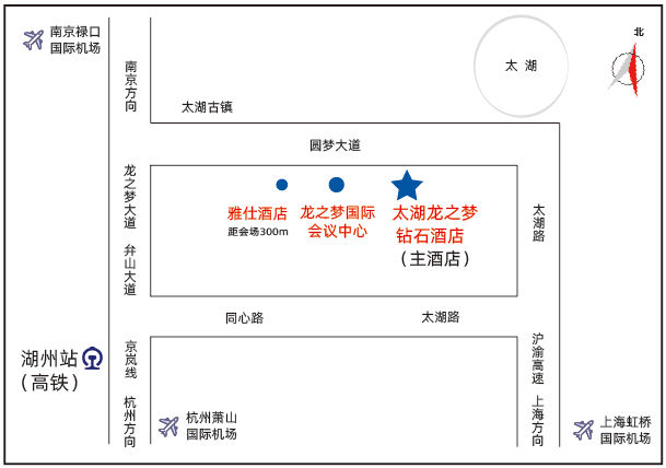 酒店位于浙江省湖州市长兴县圆梦大道,距湖州站18公里,车程约30分钟;距杭州萧山国际机场120公里,车程2小时。交通示意图如下: