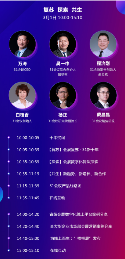 3月1日开幕论坛,以“复苏·探索·共生”主题,31会议CEO万涛、31会议创始人白桂香、31会议副总裁吴一中、31会议副总裁程治刚、31会议研究院副院长杨正、31会议销售总监戴晶晶,共同为外界呈现31会议数字会展新基建最新洞察与业务发展思路,分享国内外大型会展数字化探索实践,探讨新趋势下的新增长、新合作。
