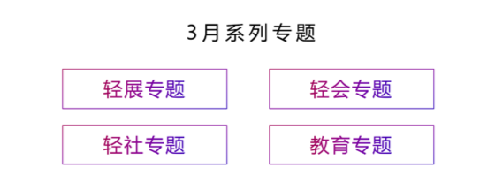 除开幕式当日的密集输出,作为“1+N”的“N”,后续系列专题是本届用户和伙伴年会的一大重头戏。系列专题将围绕着商业展会、企业活动、社团数字化、教育培训营销等重点关注的领域推出轻展专题、轻会专题、轻社专题和教育专题。